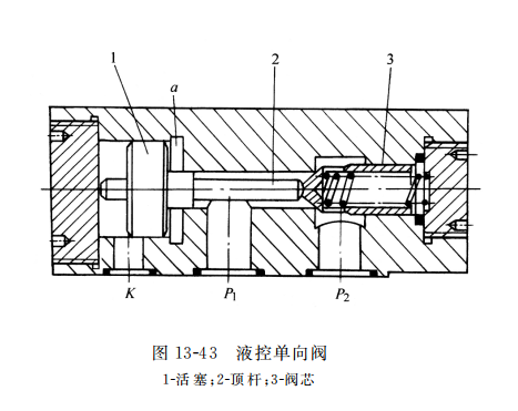如图13-43所示为液控单向阀的结构。当控制油口K不通控制压力油时,油液只能从进油口 P1 进入 ,顶开阀芯3,从出油口P2 流出 ,不能反向流动 。 当从控制油口 K通入控制压力油时 ,活塞 1 左端受油压作用而向右移动(活塞右端油腔 a 与泄油口相通 ,图中未画出) ,通过顶杆 2 将阀芯向右顶开 ,使进油口 P1 与出油口 P2 接通 ,油液可在两个方向自由流通 。 控制用的最小