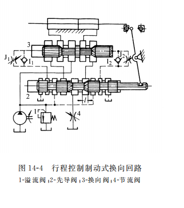 图14-3所示为时间控制制动式换向回路。这个回路中的主油路只受液动换向阀3 控制。在换向过程中,当先导阀2 阀芯被推向左端位置时,控制油路中的压力油经单向阀 I2 通向换向阀的右端,而换向阀左端的油液经节流阀 Jl 流回油箱,换向阀阀芯向左移动,阀芯上的制动锥面逐渐关小回油通道,活塞的右移速度逐渐减慢,并在换向阀阀芯移过 l 距离后将通道闭死,活塞停止运动。