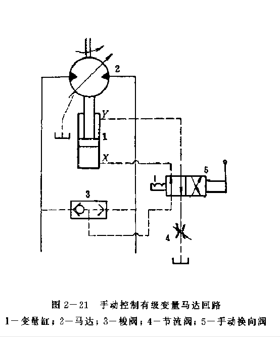 图2一21所示为控制阀加复式排量力士乐液压马达构成的双速马达回路图,这种控制方式,偏心距只能取两个极限位置。